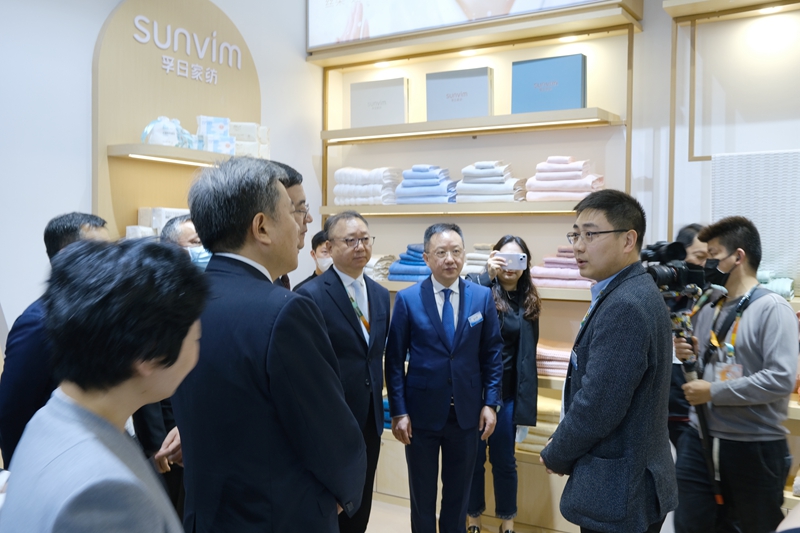 (圖為孚日集團(tuán)副總經(jīng)理、國(guó)內(nèi)品牌運(yùn)營(yíng)總負(fù)責(zé)人孫浩博帶隊(duì)參加上海春夏家紡展,中國(guó)紡織工業(yè)聯(lián)合會(huì)會(huì)長(zhǎng)孫瑞哲、中國(guó)紡織工業(yè)聯(lián)合會(huì)副會(huì)長(zhǎng)、中國(guó)家用紡織品行業(yè)協(xié)會(huì)監(jiān)事長(zhǎng)楊兆華參觀孚日展位)
